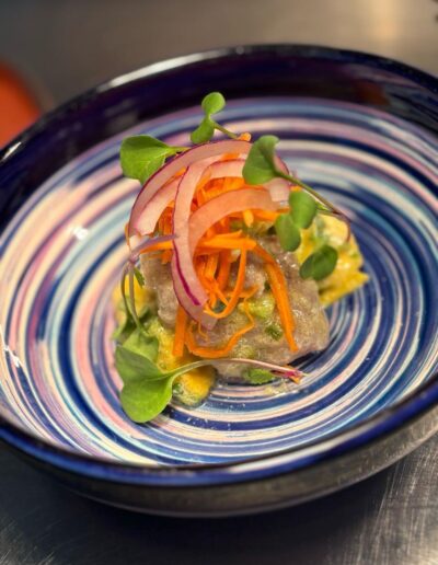 Ce menu met en valeur les produits locaux (poissons frais, fruits exotiques, épices) tout en gardant une touche gastronomique raffinée. Un vrai voyage pour les papilles !